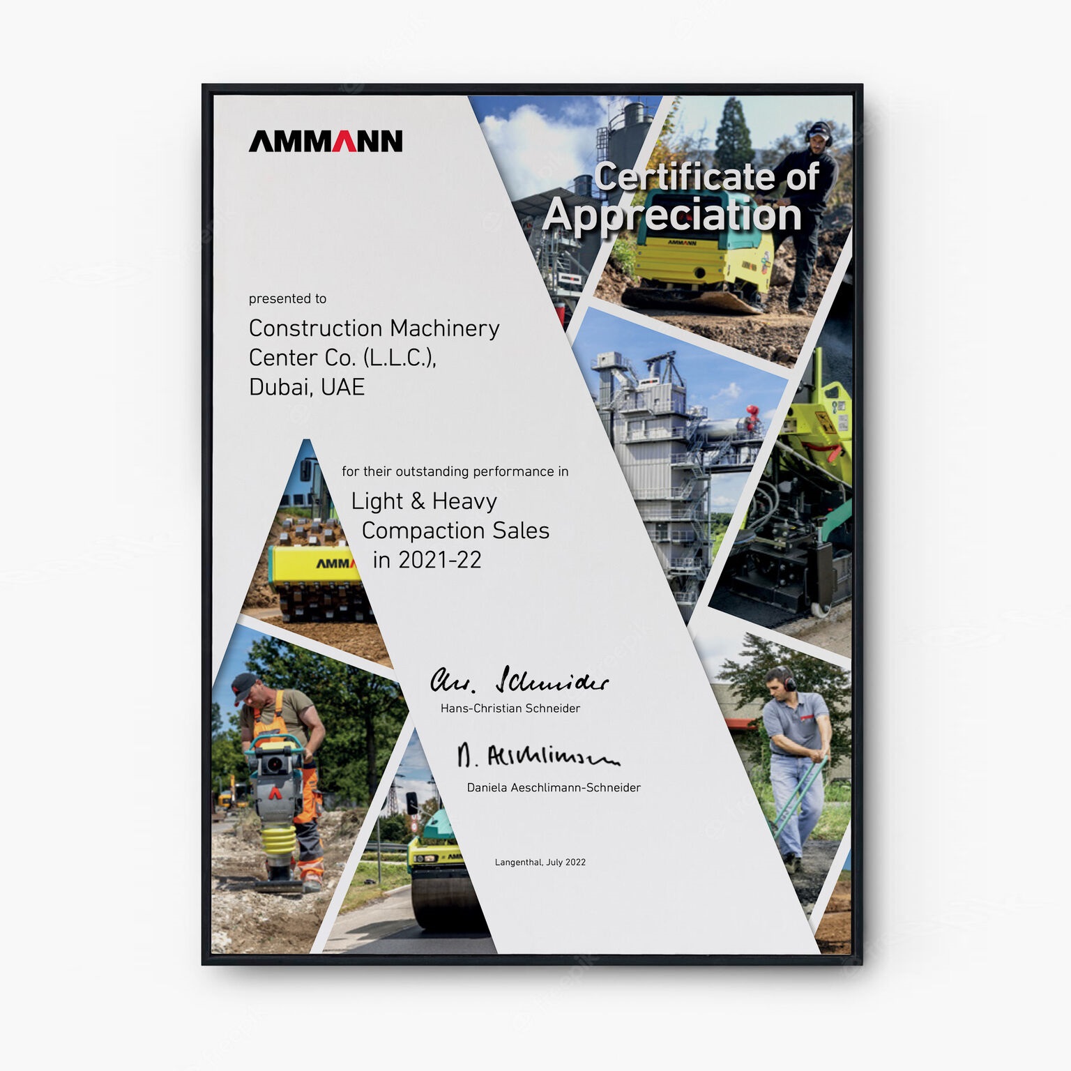 AMMANN Certificate of Appreciation presented to Construction Machinery Center