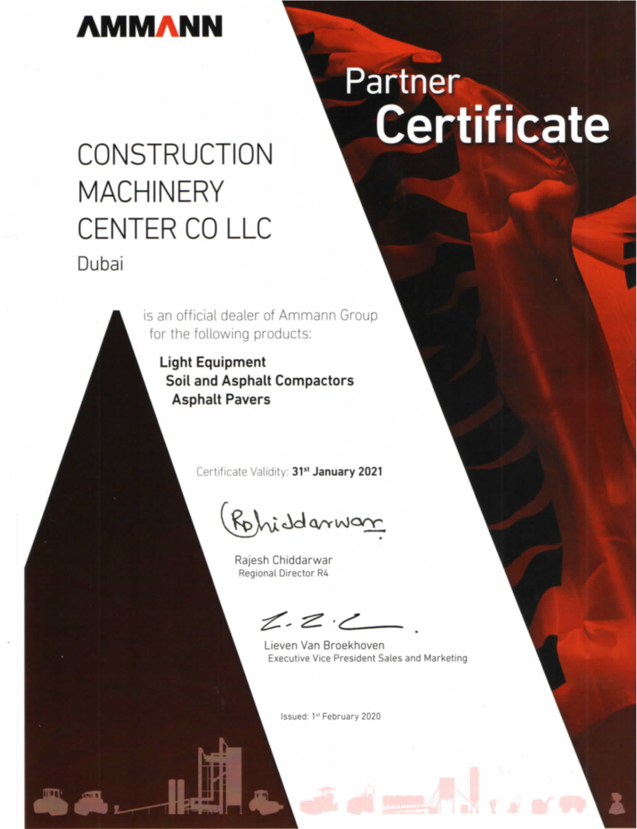 Construction Machinery Center Co LLC became the official dealer of Ammann Light Equipments, Soil & Asphalt Compactors and Asphalt Pavers.